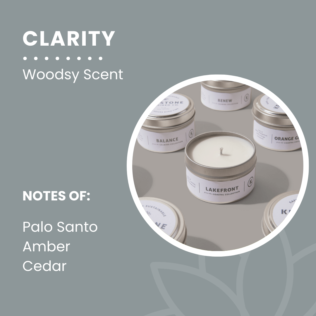 Our Clarity Candle creates feelings of relief and hope using Cedar and Palo Santo -- it is said that that Palo Santo brings positive energy while improving mental clarity, promoting relaxation and good health.