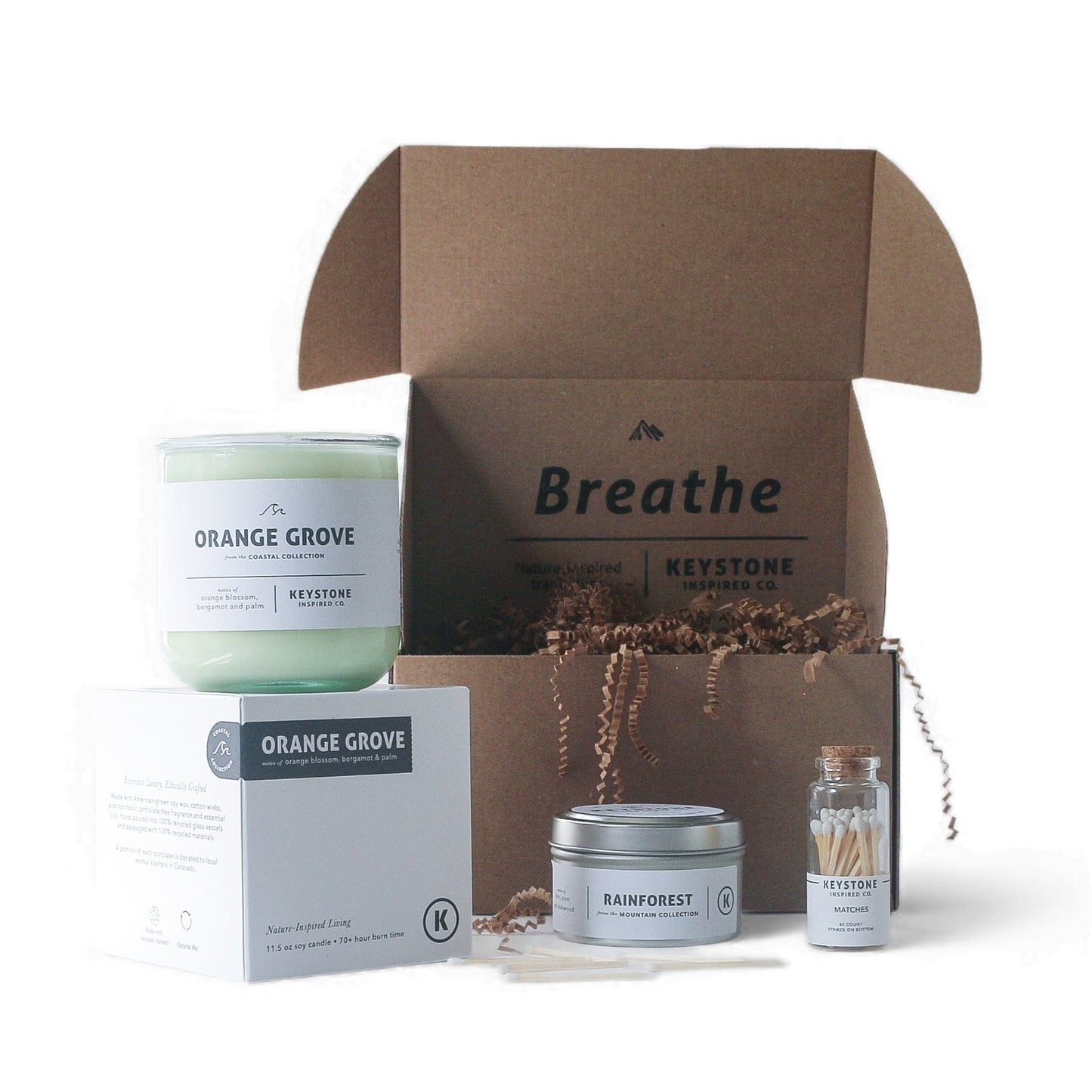 Give the gift of relaxation. Our Orange Grove glass jar features a unique blend of palm, bergamot, and orange blossom, while the Rainforest tin has an earthy scent with notes of fern, teakwood and pine. Each set comes with matches and is wrapped in eco-friendly materials for a personal touch.