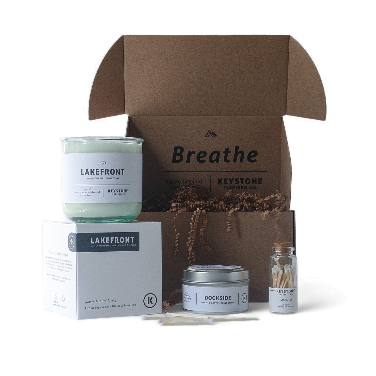 Give the gift of relaxation. Our Lakefront glass jar features a unique blend of mandarin, vanilla and sandalwood, while the Dockside tin has a refreshing scent with notes of driftwood, oakmoss and bergamot. Each set comes with matches and is wrapped in eco-friendly materials for a personal touch.